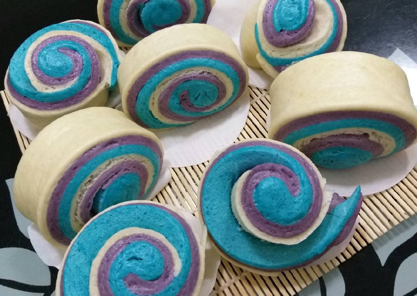 - 300 gr tepung terigu protein rendah - 60 gr tepung maizena - 1 sdt baking powder - 1 sdt ragi instan - 70 gr gula pasir - 1 sdm susu bubuk - 1/4 sdt vanili bubuk - 170 ml air (Saya susu cair) - 30 gr mentega putih - Sejumput garam - Secukupnya pewarna makanan ungu dan biru